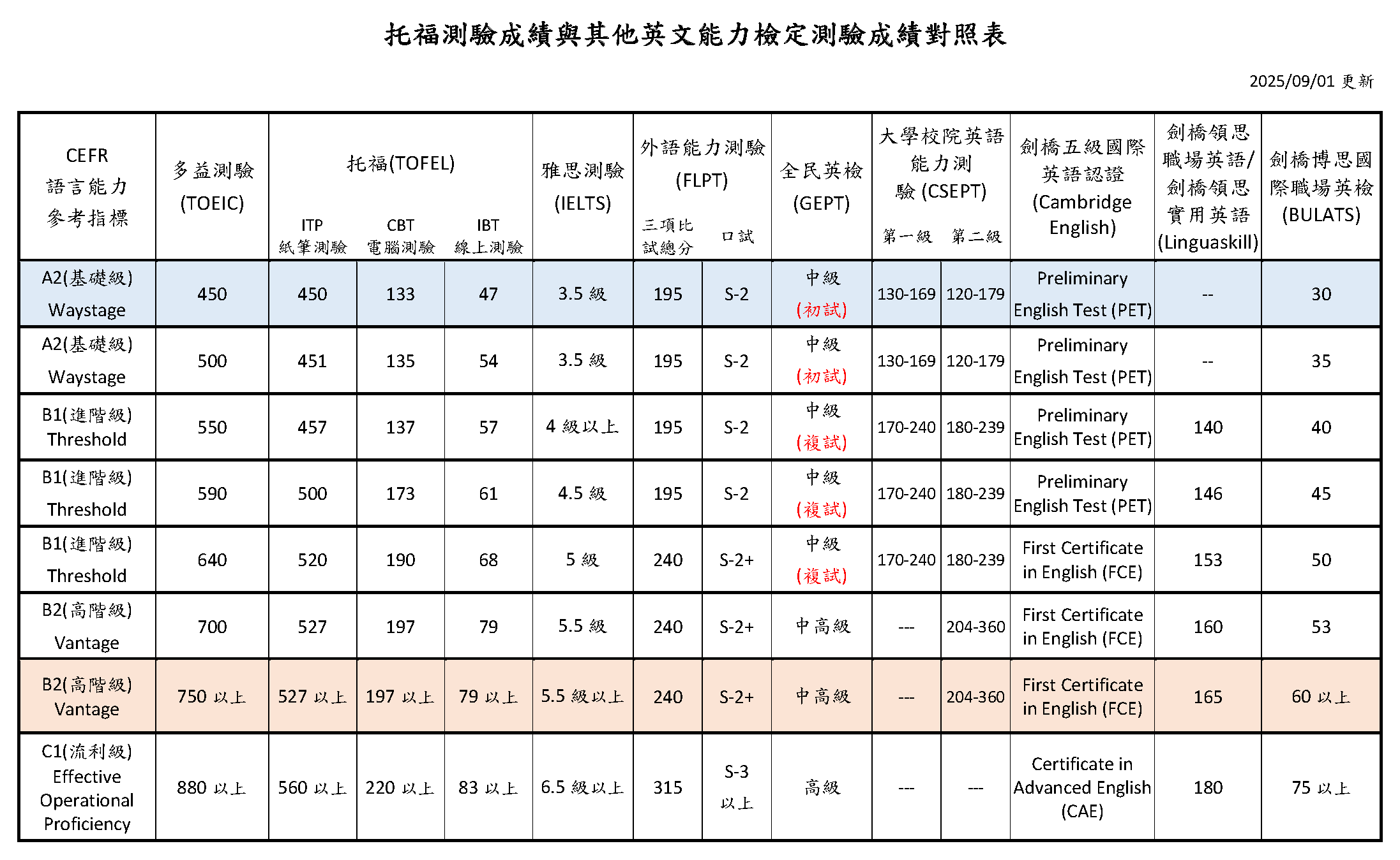 英文檢定畢業門檻對照表