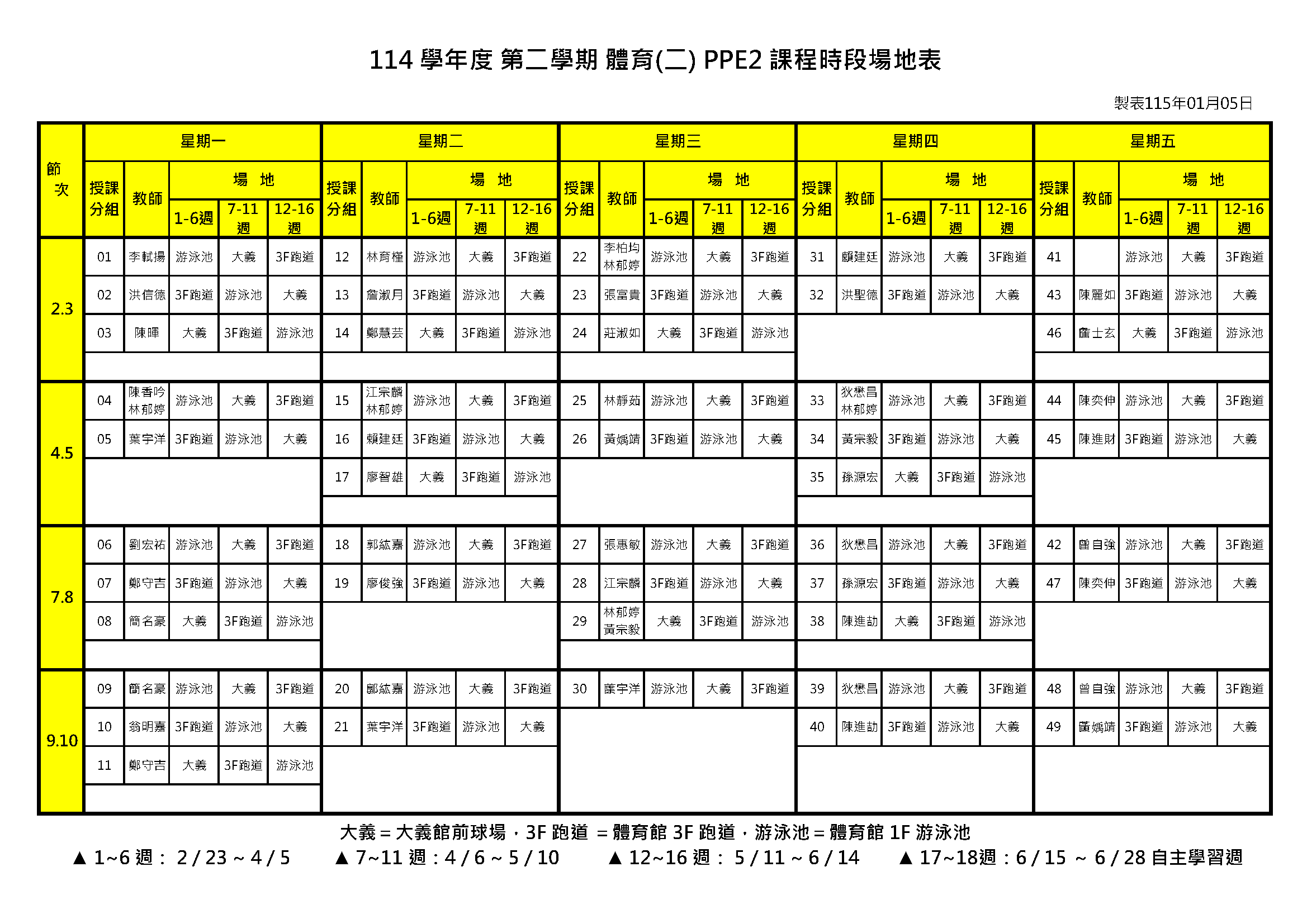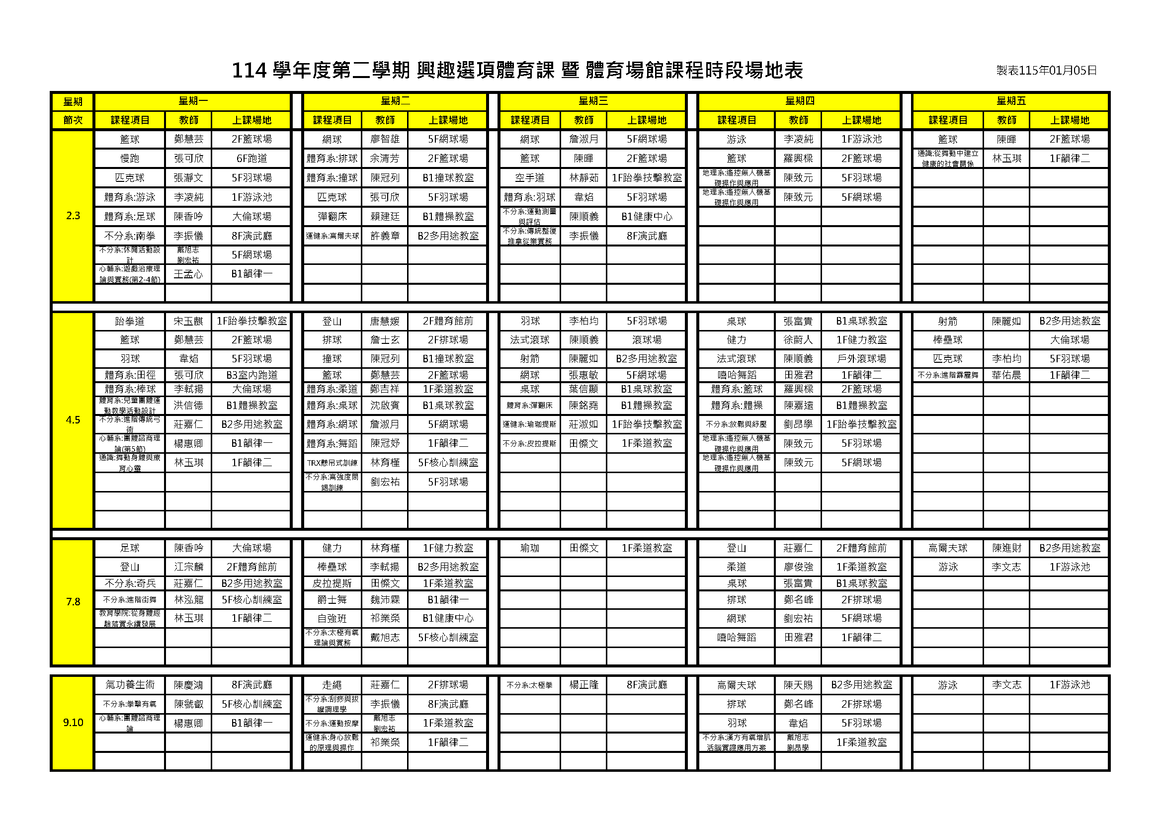 114學年度第2學期大一體育(二)、興趣體育及雨備教室 上課時間暨場地表